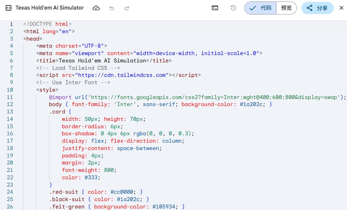 Gemini 3 确实在 AI 创作层面带来了真正意义上的跃迁。过去,如果你想做一款能够“自己运行”、具备决策逻辑、动态筹码计算、玩家行为模拟的德州扑克模拟器,往往至少需要多名技术人员,配合开发者写出完整的状态机、概率模型与 UI 交互逻辑。